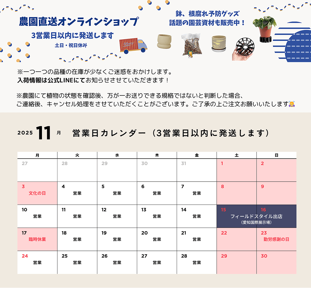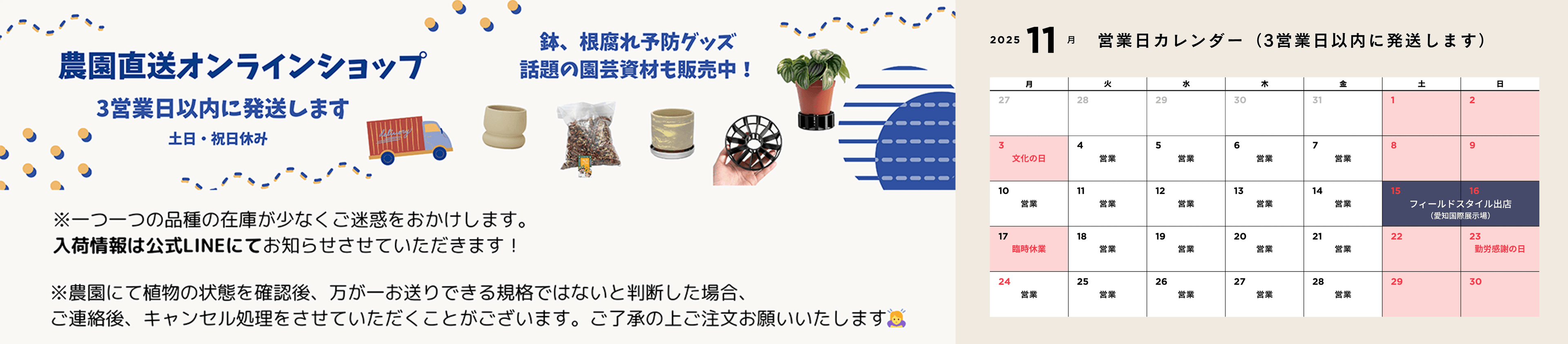 いつもご愛顧いただき、ありがとうございます! 現在決まっているイベントの情報です。 お近くで開催の際は、ぜひ実際に植物たちを手に取っていただければ嬉しいです。 皆さまにお会いできるのを楽しみにしています!
