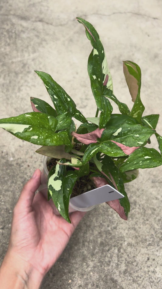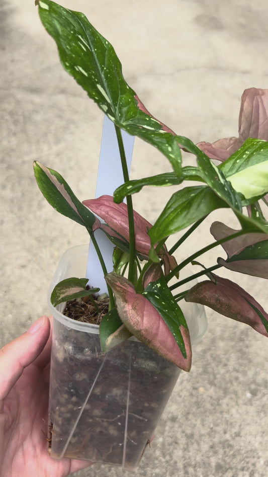 【現品販売】シンゴニウム レッドスポットトリカラー 透明鉢 ネガミエル ねこチップ 3号 プラ鉢 希少