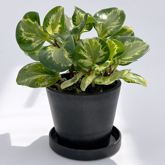 【現品販売】ペペロミア オブツシフォリア レモンスカッシュ BLACK PLASTIC POT 4号 黒 プラ鉢 受け皿付き ねこチップ