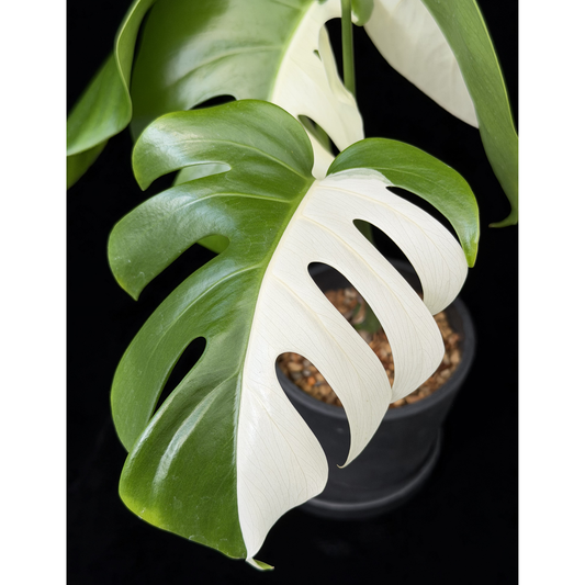 【一点もの】モンステラ ボルシギアナ ホワイトタイガー 斑入り ハーフムーン 4号 プラスチック鉢 BLACK PLASTIC POT 受け皿付き