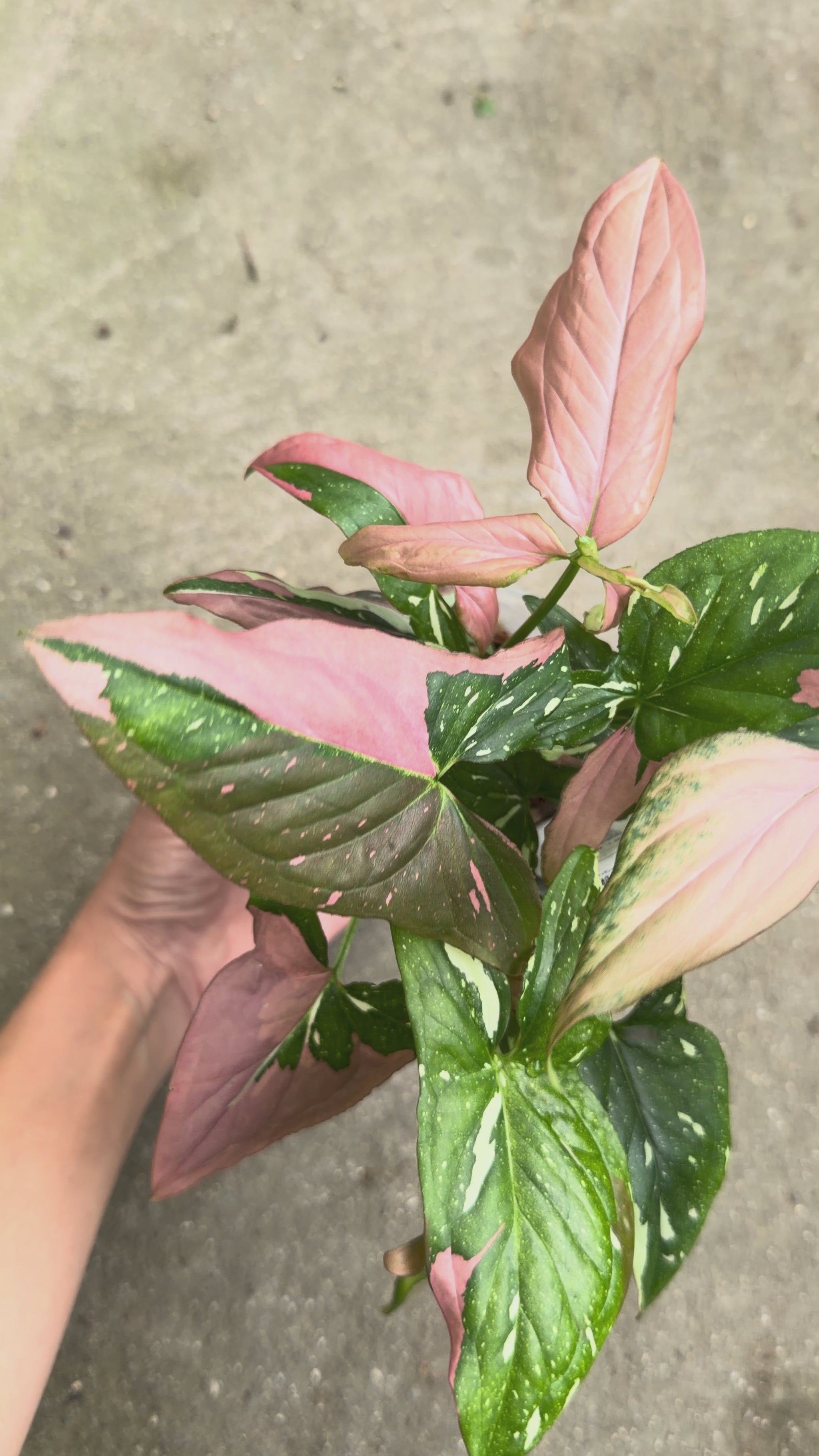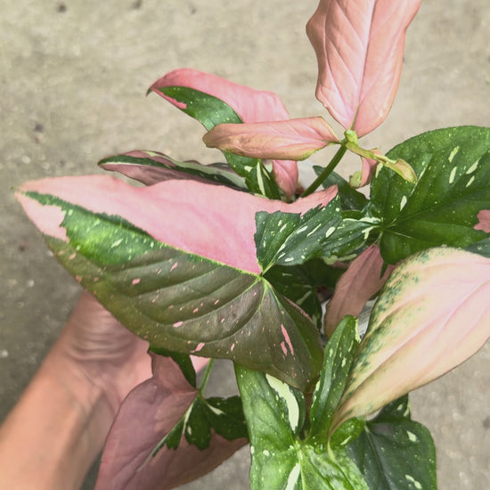 濃い緑色の部分と薄緑の散り斑、発色の良いピンク、それぞれのコントラストが美しい個体です。登らせたり、支柱に添わせるのもおすすめ♪