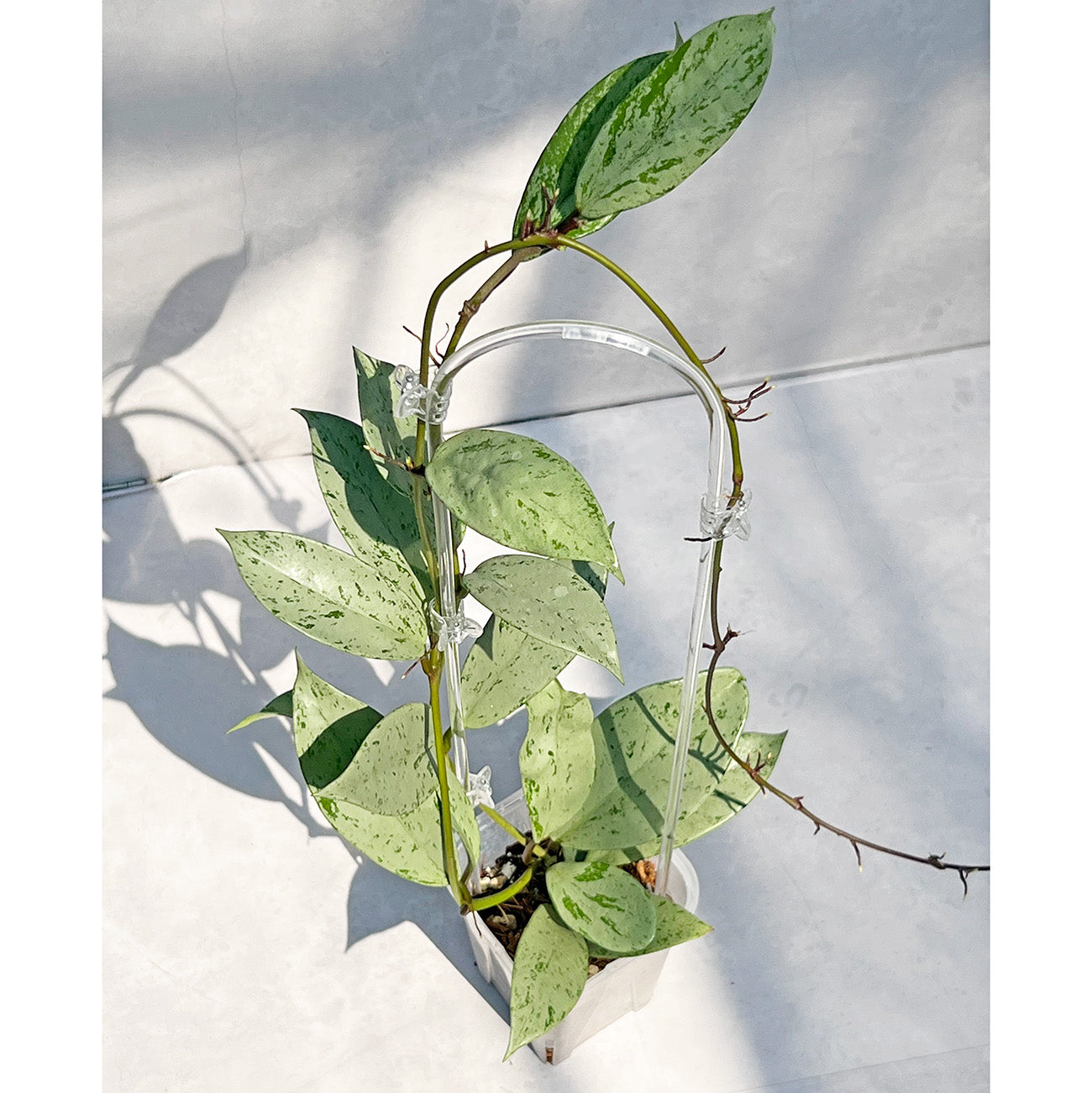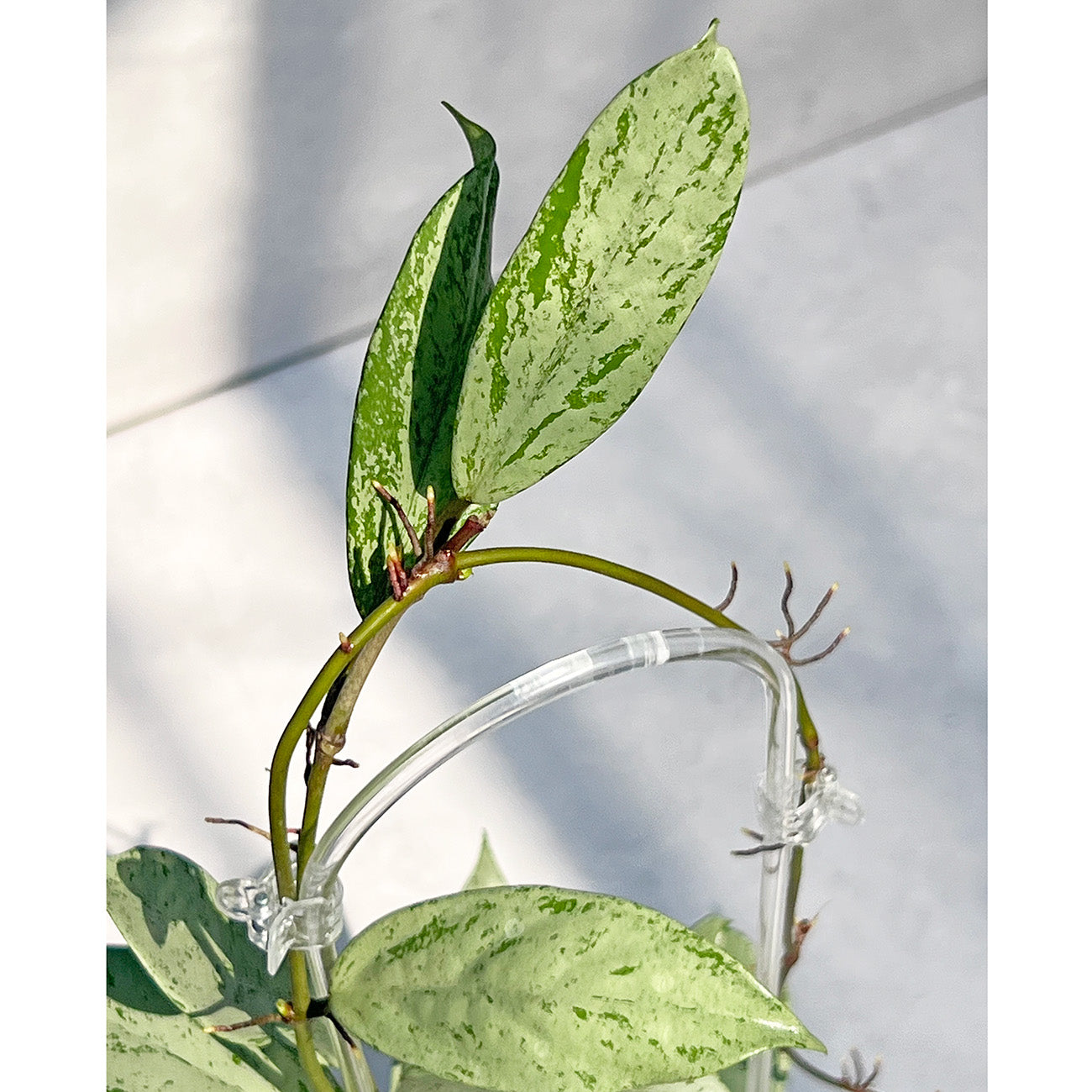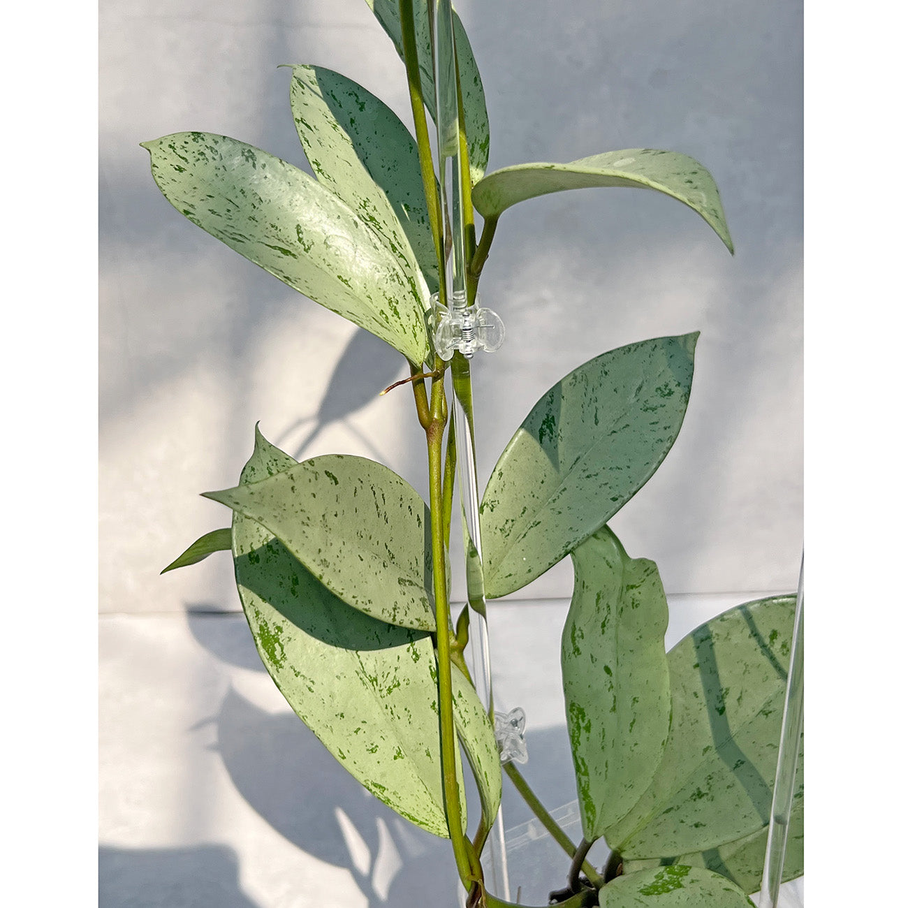 このホヤ・シルバーゴーストは、葉と葉の間隔が広めなのも特徴で、透明のトレリス(支柱)とクリップで美しく誘引すれば、成長の姿もインテリアの一部に。