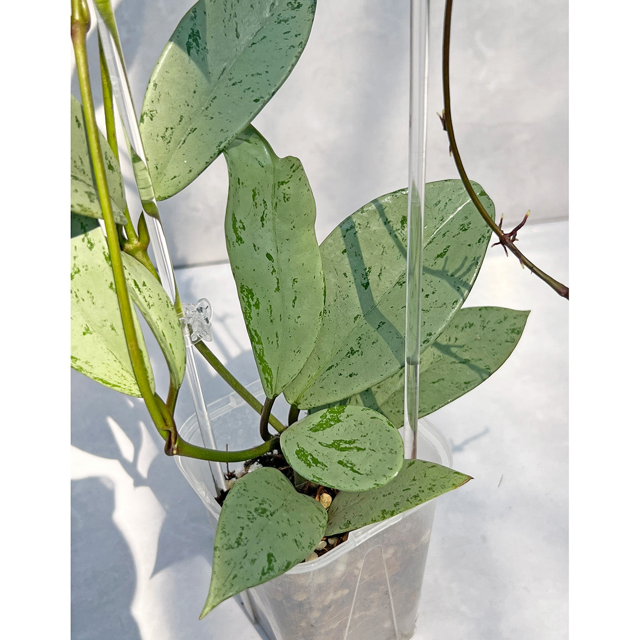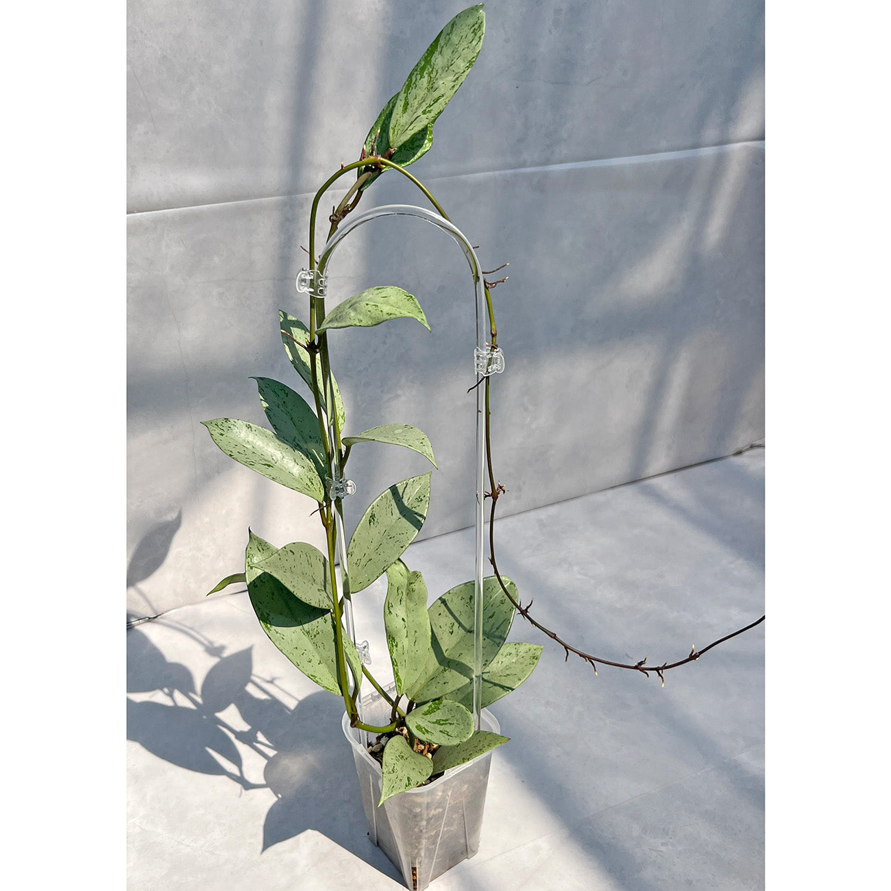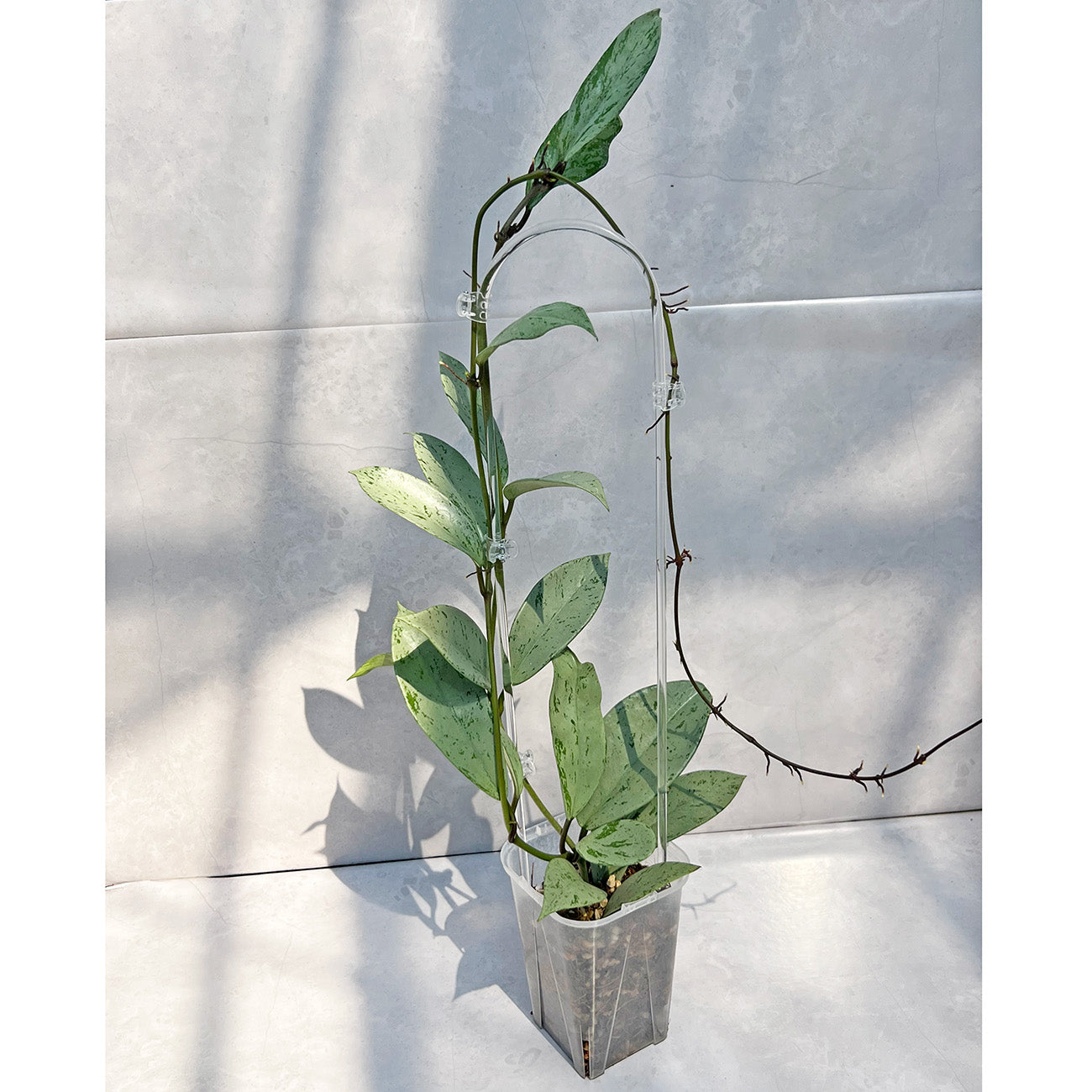 このホヤ・シルバーゴーストは、葉と葉の間隔が広めなのも特徴で、透明のトレリス(支柱)とクリップで美しく誘引すれば、成長の姿もインテリアの一部に。